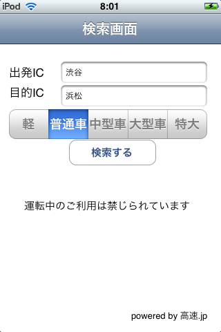 iPhone/iPod Touch 用アプリ.高速インターチェンジ間の料金,時間,距離を簡易検索するソフト.高速.jp? 様の API を使わせていただいてます。