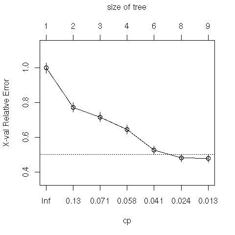 この図で,横の点線は,最小点の平均から標準誤差一個分を表し,この線より下のcpが適当とみなされる.
